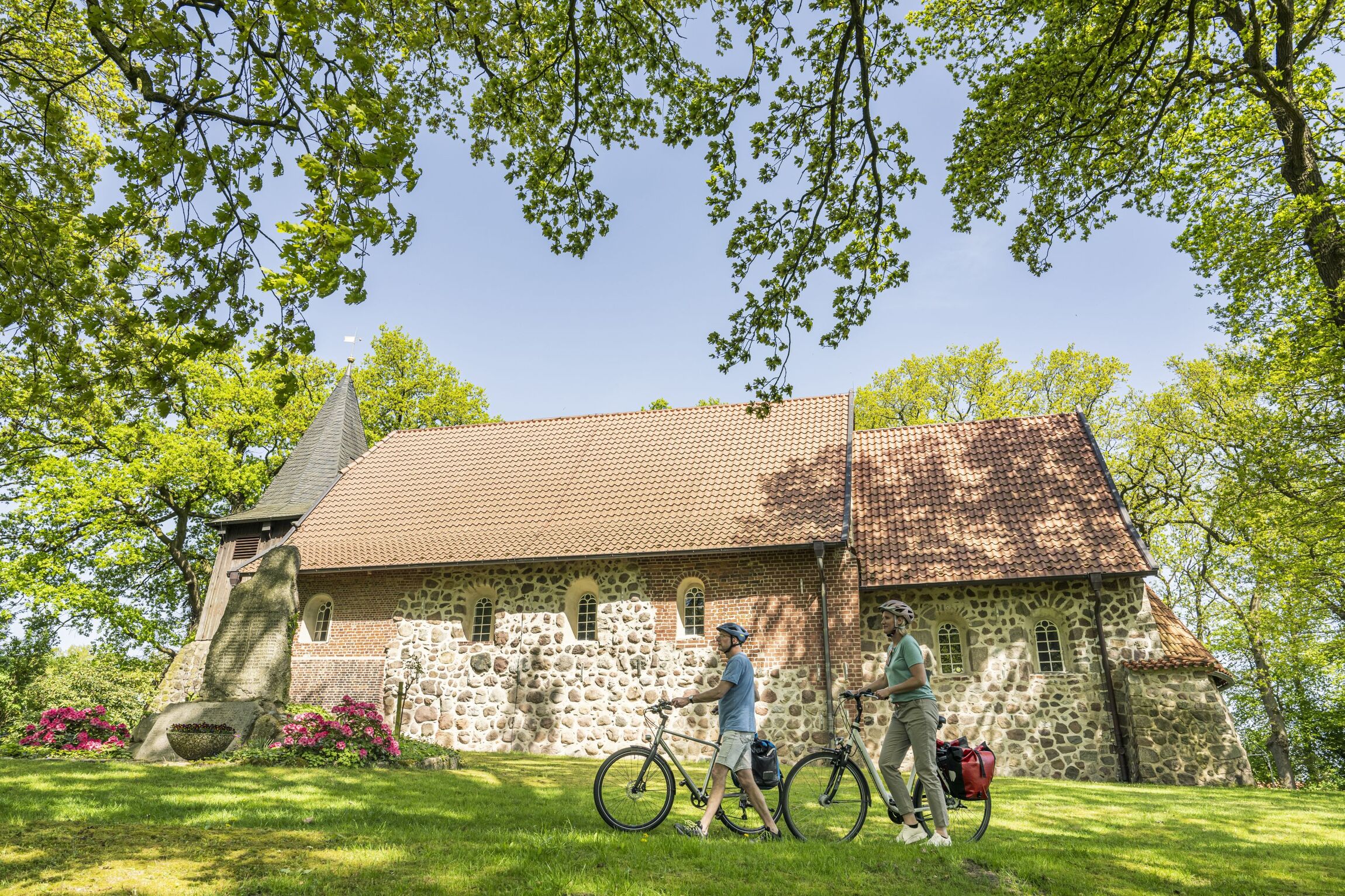 Die Radreise startet an einem prachtvollen spätgotischen Dom mit zwei 90 Meter hohen Kirchtürmen, dem Bremer St. Petri Dom. Der heutige Bau wurde im 11./12. Jahrhundert im romanischen Stil begonnen, später im gotischen Stil erneuert und zuletzt im 19. Jahrhundert baulich bedeutend erweitert. Ein ganz anderes Bild bietet die St. Katharinenkirche in Bliedersdorf. Sie gilt als eines der ältesten Feldsteingotteshäuser zwischen Elbe und Weser. Um sie rankt sich die Sage, dass nachts, als die Menschen im Ort schliefen, Engel die schweren Steine der umliegenden Äcker für den Kirchenbau herantrugen. St. Katharinen ist an den Wochenenden von Mai bis September verlässlich von 10.00 bis 17.00 Uhr geöffnet und auf Anfrage besteht die Möglichkeit für Pilger, im Gemeindehaus zu übernachten.