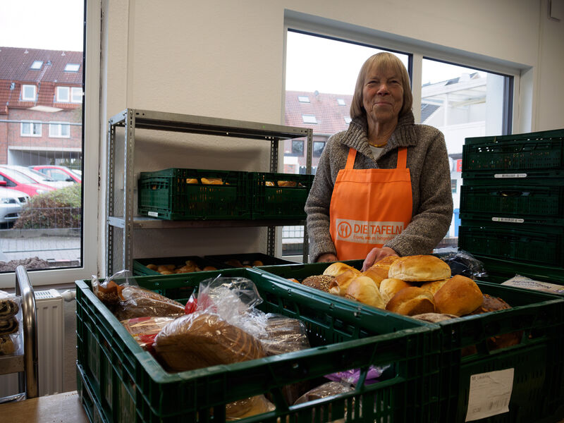 Frauke Bergner suchte und fand als Rentnerin eine sinnvolle Aufgabe. Bergner koordiniert den Ablauf und den Personaleinsatz bei der Ausgabe und schaut, welche Ware in welcher Menge vorhanden ist. Bergner: „Im Moment haben wir ein wenig Chaos, aber das war zu erwarten. Wir freuen uns hier am neuen Standort über eine Küchenzeile und einen kleinen Aufenthaltsbereich. Für mich gehört die Tafel in die Innenstadt. Ich habe auch nicht das Gefühl, dass die Leute sich schämen. Wir vermissen hier die älteren Frauen mit kleinen Renten. Wir wissen, dass es diese gibt, aber die trauen sich wohl häufig nicht.“