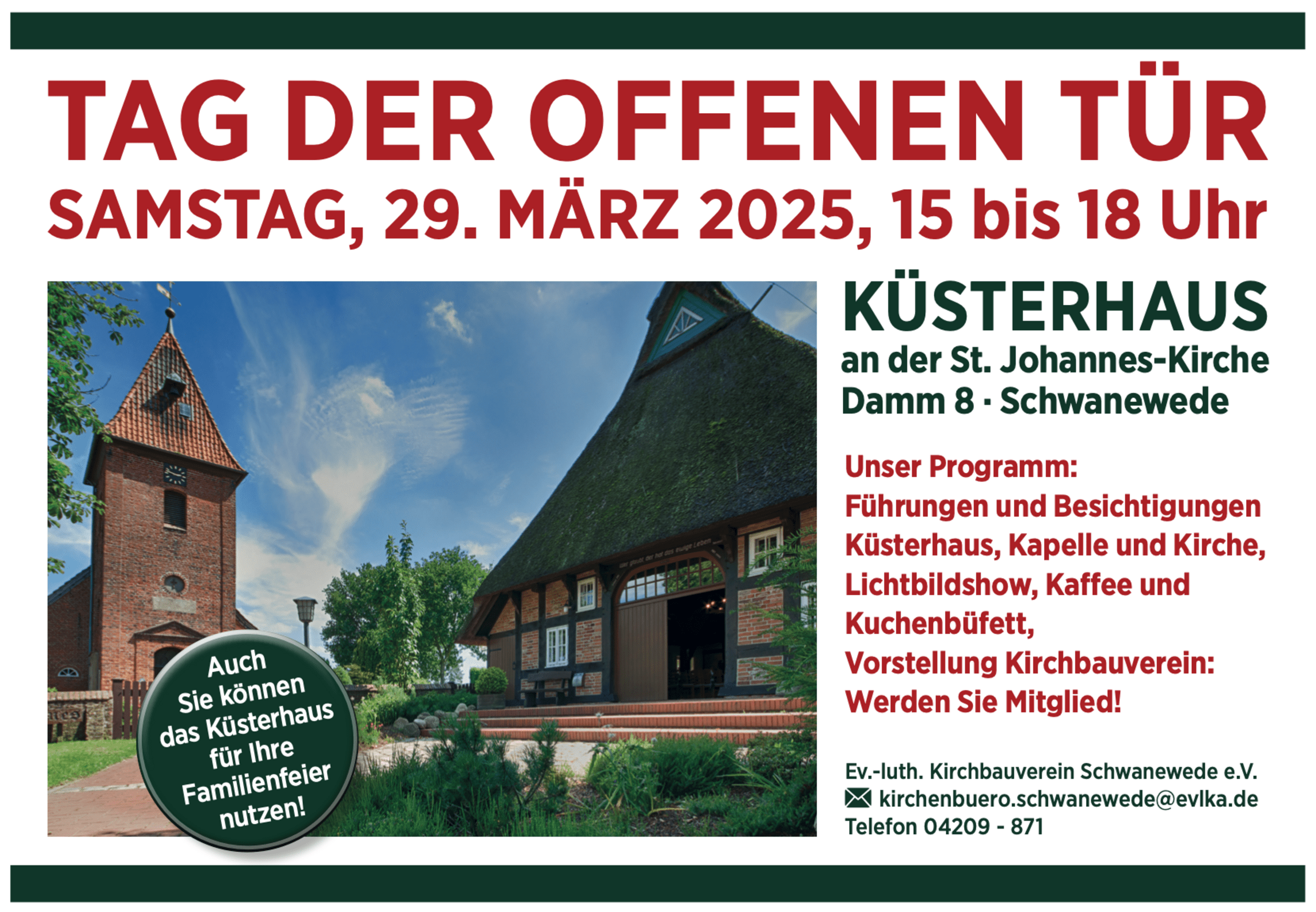 Der Kirchbauverein Schwanewede lädt am Samstag, 29. März 2025, in der Zeit von 15.00 bis 18.00 Uhr, zum Tag der offenen Tür ein.