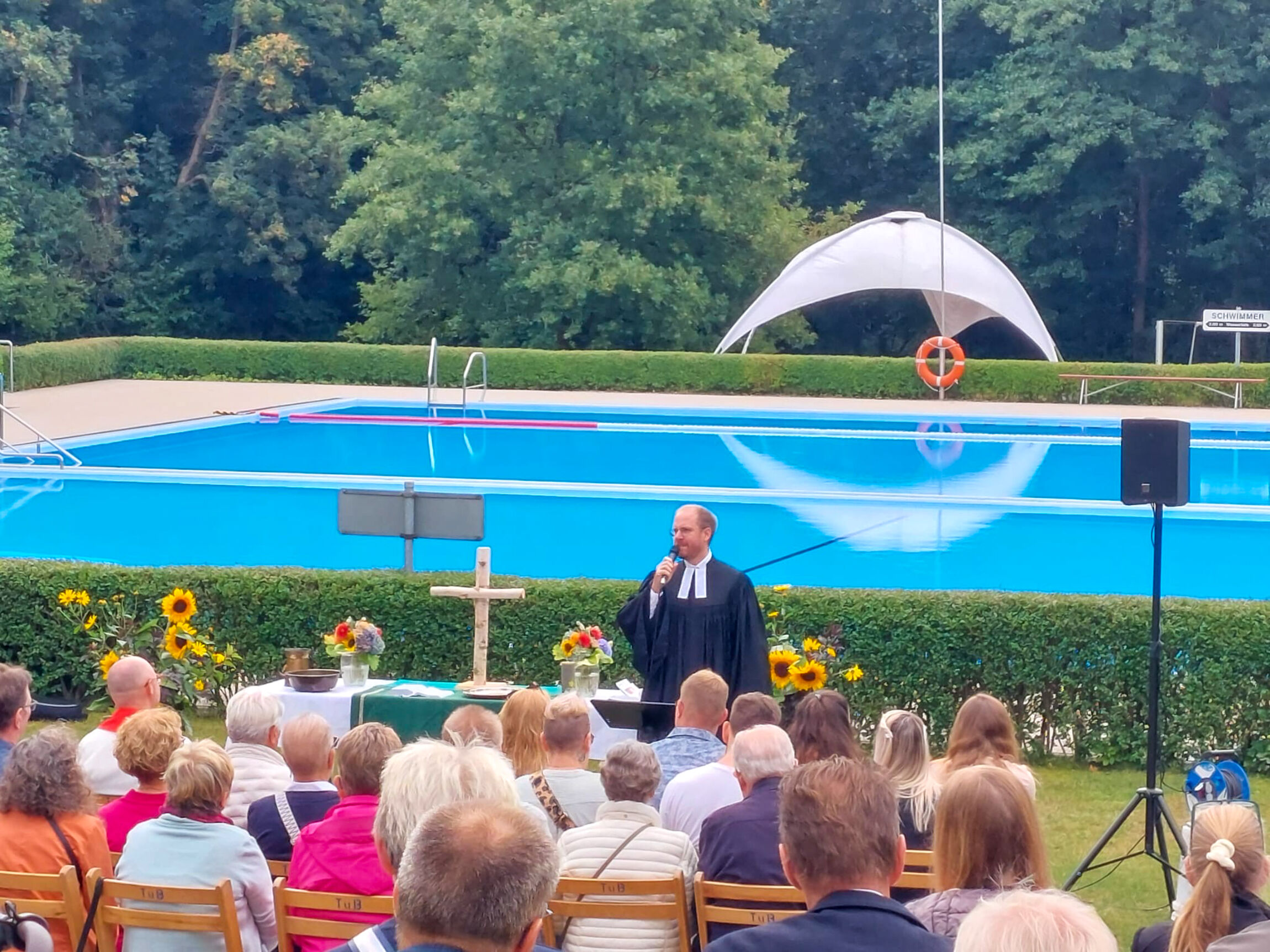 Am 31.08. fand zum dritten Mal der regionale Schwimmbadgottesdienst mit Taufen statt. Zusammen mit dem Förderverein Timkebad luden die beiden Kirchengemeinden der Region TaWiKi (Tarmstedt – Wilstedt - Kirchtimke) ins Freibad nach Kirchtimke ein. Im Zentrum stand wie jedes Jahr die Taufe. Pastor Benjamin Fromm hob die Freude hervor, die in der Taufe steckt. „Heute nörgeln wir nicht – ob über das Wetter, den Sommer oder über die Arbeit. Heute freuen wir uns über die Liebe Gottes, die in der Taufe zum Ausdruck kommt.“ Was erst theoretisch in der Predigt zum Ausdruck kam, sollte natürlich auch ganz praktisch erfahrbar werden. Unter der Mithilfe aller Besucher*innen, die eine Menschenkette bildeten und das Taufwasser bis nach vorne weiterreichten, wurden zwei Kinder im Babyplanschbecken getauft. Sie gehören ab jetzt zur Kirchengemeinde und zur weltweiten Christenheit dazu. Musikalisch begleitet wurde der Gottesdienst vom Kirchtimker Posaunenchor. Im Anschluss nutzten viele Besucher*innen die Chance, noch zu bleiben und bei Kaffee, Schwimmbad-Pommes oder Kaltgetränken den Sonntag zu genießen. Einige wenige wagten auch den Sprung ins kalte Nass und genossen so die letzte Möglichkeit in diesem Jahr zu schwimmen – denn das Timkebad befindet sich nun schon in der Herbst- und Winterpause.