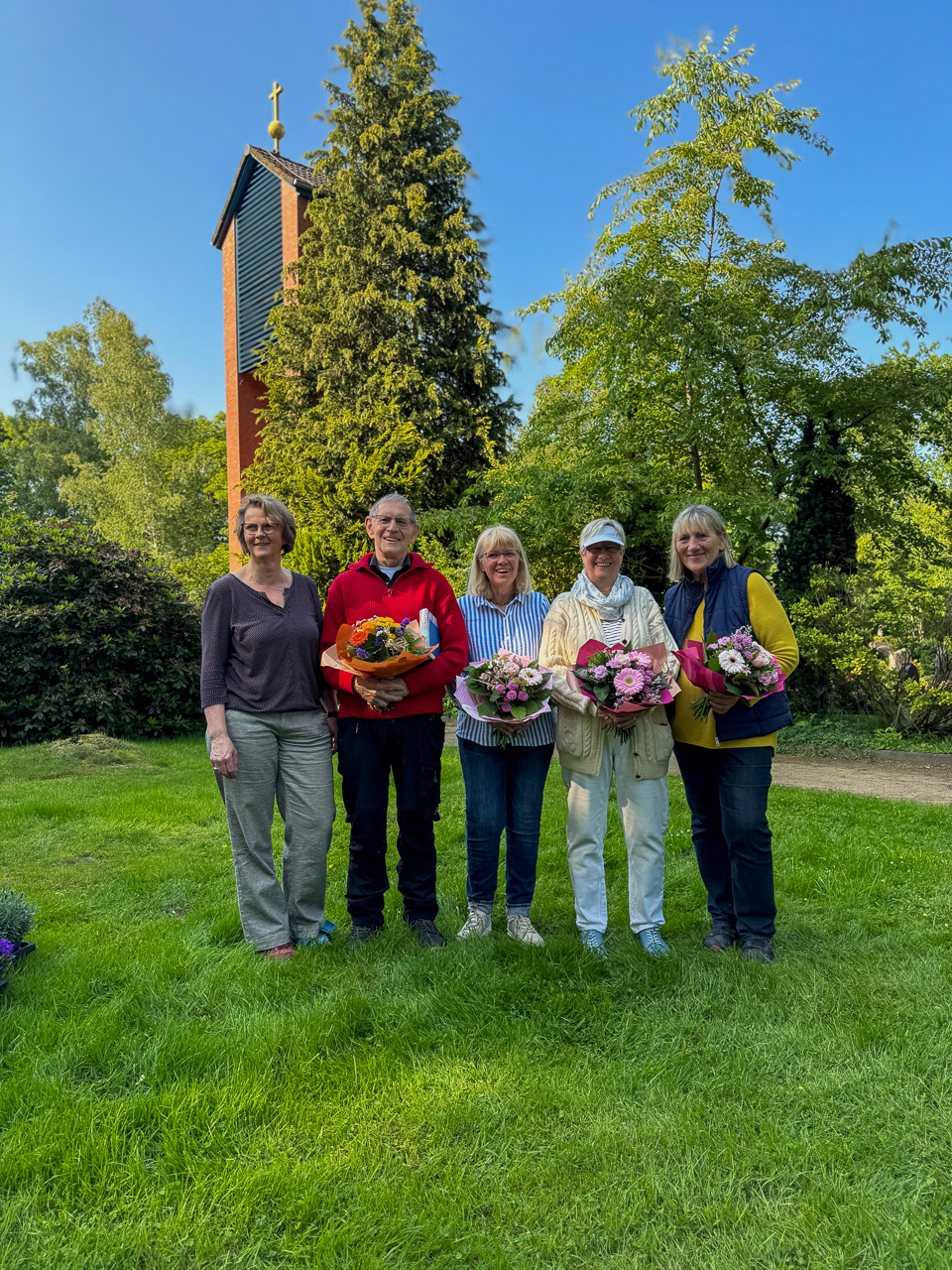 Ein besonderer Moment war der offizielle Teil des Festes, der auf dem gegenüberliegenden Friedhof stattfand. Hier fanden sich die Teilnehmenden in einem Segenskreis zusammen. Superintendentin Jutta Rühlemann würdigte das Wirken des Hospizdienstes mit sehr persönlichen und berührenden Worten: „Das ist etwas Besonderes hier, und ich bin sehr gern dabei, Sie in Ihrem Ehrenamt zu unterstützen – bei einer Aufgabe, bei der viele sagen: ‚Das kann ich mir gar nicht vorstellen.‘ Sie sind eine tolle Gruppe mit einem besonderen Angebot unter der Trägerschaft des Diakonischen Werks. Für die Menschen, die unser Angebot in Anspruch nehmen, spielt es keine Rolle, ob sie Kirchenmitglied sind oder nicht – wir zeigen uns offen.“
