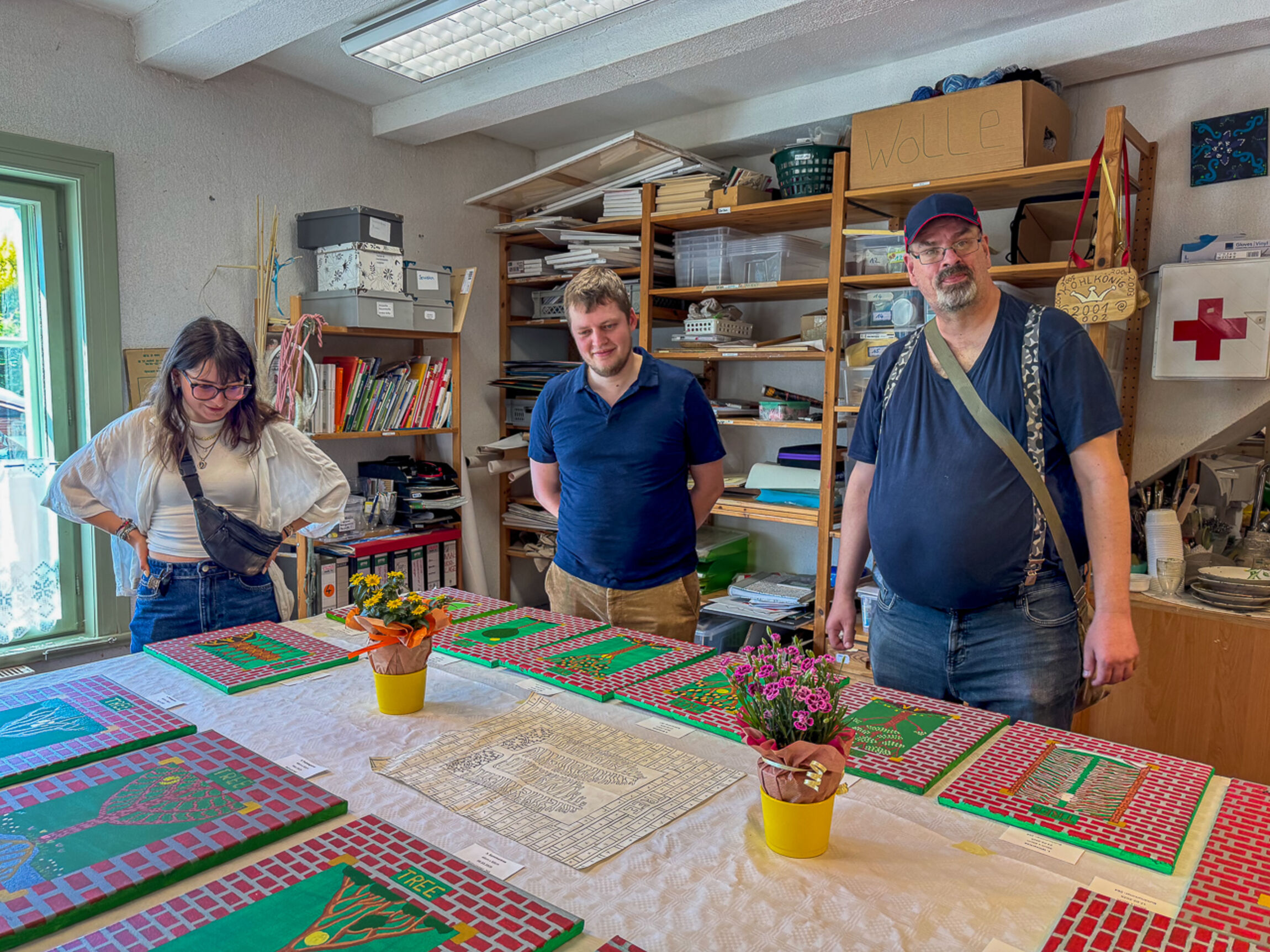 Auch eine Vielzahl weiterer Kunstwerke aus der Therapiegruppe, die sich seit zehn Jahren regelmäßig in der Tagesstätte trifft, schmückten die Wände – ein Beleg für die kreative Vielfalt, die hier seit Jahrzehnten gelebt wird.